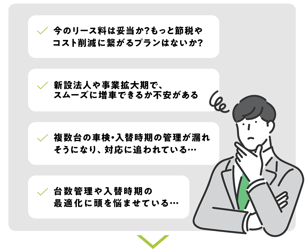 ※表示価格は一例です。お選びいただく車両(新車・新古車・中古車)や架装、リースの期間によって、貴社に最適なプランを個別にお見積りいたします。